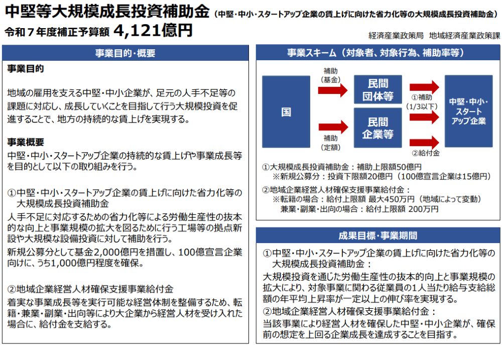 正式名称は「中堅・中小スタートアップ企業の賃上げに向けた省力化等の大規模成長投資補助金」で、工場新設や大規模な物流拠点整備など、投資額が20億円(100億宣言企業の場合は15億円)を超えるような事業を支援します。