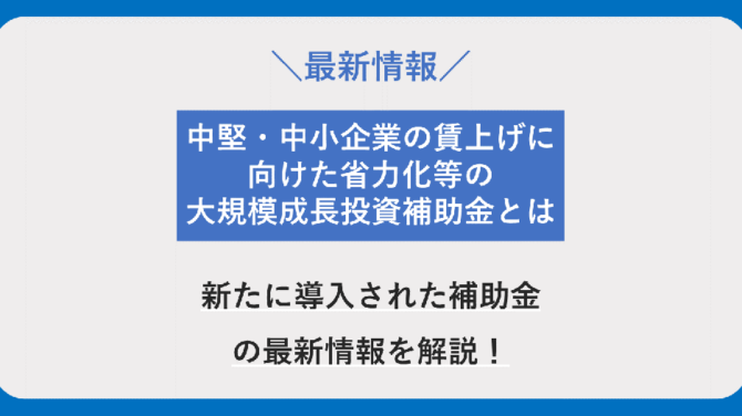 大規模成長投資補助金(正式名称:中堅・中小・スタートアップ企業の賃上げに向けた省力化等の大規模成長投資補助金)は、中堅・中小・スタートアップ企業が、持続的な賃上げを目的とし、人手不足解消のための省力化等による労働生産性の向上や、事業規模の拡大を図るための工場などの拠点新設等、大規模な投資を支援する制度です。