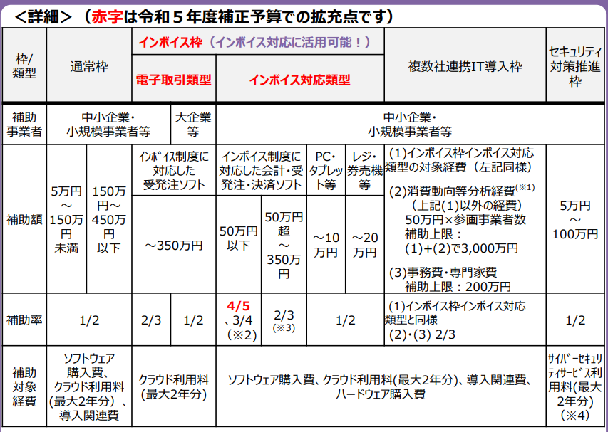 ECサイト等が補助対象であったデジタル化基盤導入類型がなくなり、インボイス対応への補助を充実させた形となりました。