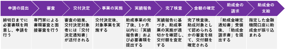 本助成事業のスケジュールは、申請の提出から助成金の交付まで3か月程度で完了します。具体的には以下の図のように設定されており、これに従って手続きを進めていきます。スケジュールを十分に把握し、計画的に行動することが必要になります。