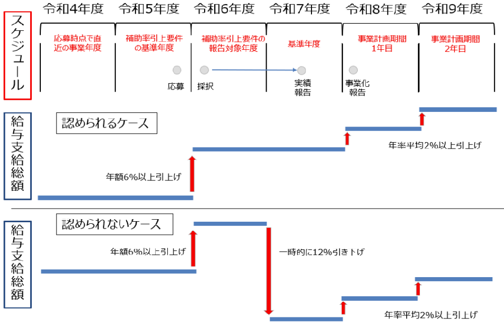 さらに、要件として、「応募時点で直近の事業年度の給与支給総額」と「基準年度の給与支給総額」を比較したときに、「応募時点で直近の事業年度の給与支給総額」 ≦ 「基準年度の給与支給総額」であることも必要です。つまり、応募した後に簡単に要件を達成できるように基準年度の賃金を引き下げることは認められません。