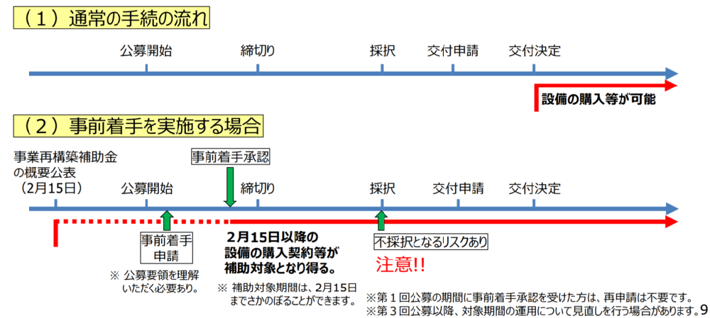 下図は中小企業庁が公表している「事業再構築補助金の概要」から引用した図です。図のように、(1)通常の手続きの流れでは交付決定後から設備の購入等が可能となっている一方で、(2)事前着手を実施する場合では、交付決定に先立ち2月15日以降の設備の購入契約等が可能となっています。