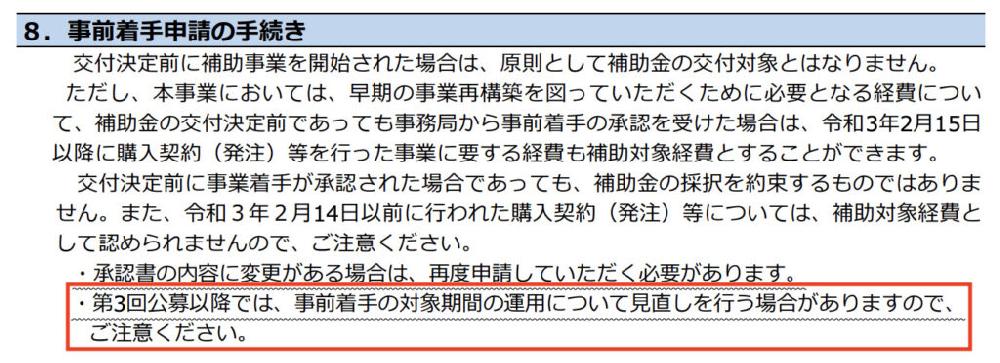 3次締切以降でも事前着手申請制度が継続されるかの判断は非常に難しいですが、あくまで弊社の推測としては、緊急事態宣言の延長もあったことから、大幅な見直しは行われないと予想しています。7月末にも第3回の公募の詳細発表がある予定です。