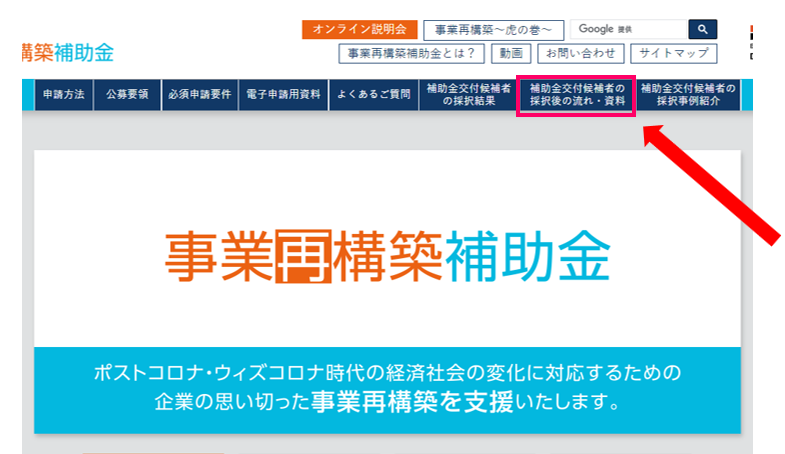 2.上部にある「補助金交付候補者の採択後の流れ・資料」の項目をクリックする