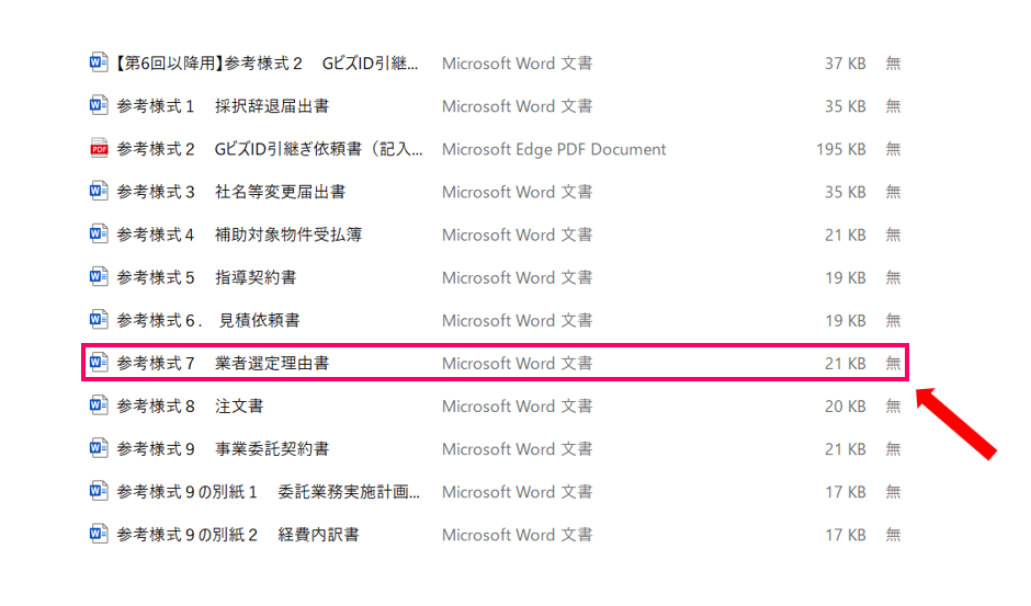 4.「参考様式7 業者選定理由書」と記載されたWordファイルを選択し、内容を記載する