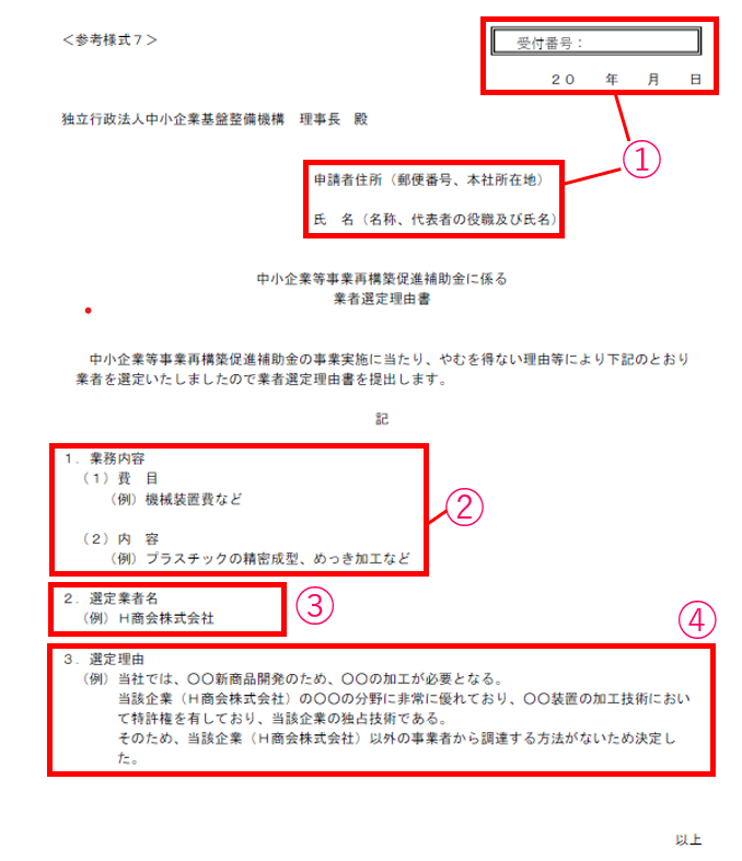 ここでは、「参考様式7 業者選定理由書」について、項目別の書き方を詳しく解説します。