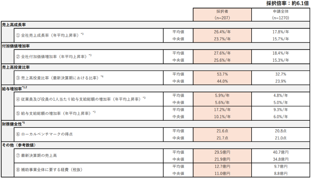 上限5億円の補助金が企業経営に与える影響が相対的に大きく、成長加速に寄与しやすい。 - 売上高成長率・付加価値増加率が高まりやすい
