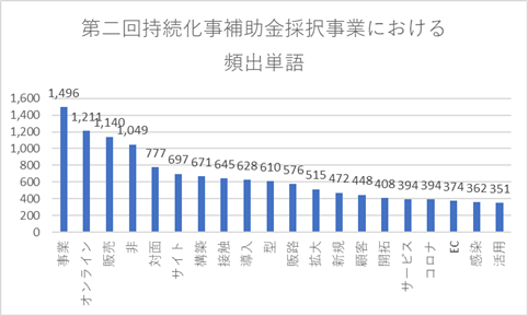 さらに、697件数出現する「サイト」の文言ですが、うち「ECサイト」の構築という内容がその半数以上を占めていました。低感染型ビジネスの構築においても、とくにECサイトを設立する事業は採択件数が多いということがわかります。