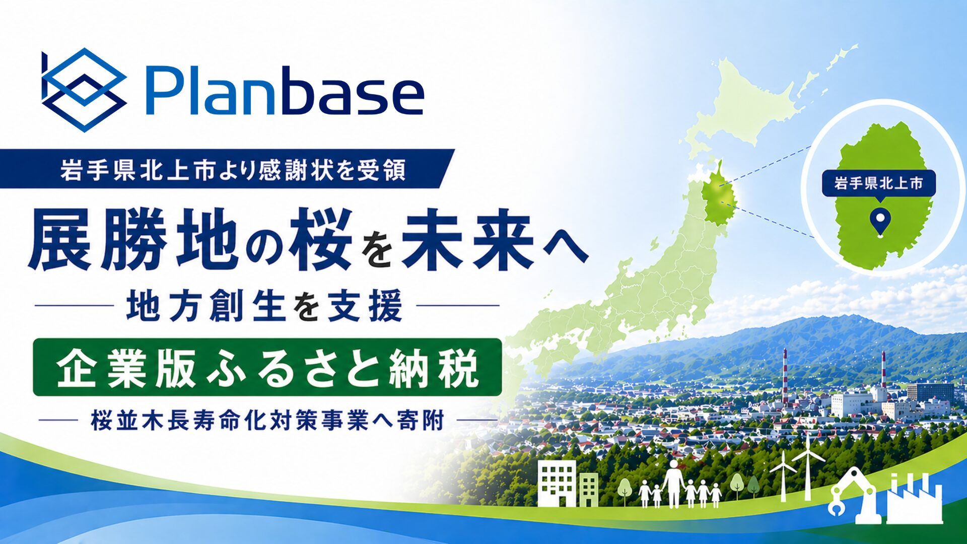 株式会社プランベース(本社:東京都千代田区、代表取締役:武衣 貴志)は、岩手県北上市に対し、「企業版ふるさと納税(地方創生応援税制)」に基づく寄附を行いました。本寄附は、同市の「展勝地桜並木長寿命化対策事業」を支援するものであり、2026年4月23日に北上市役所本庁舎にて開催された贈呈式において、北上市長より感謝状を受領いたしましたので、お知らせいたします。