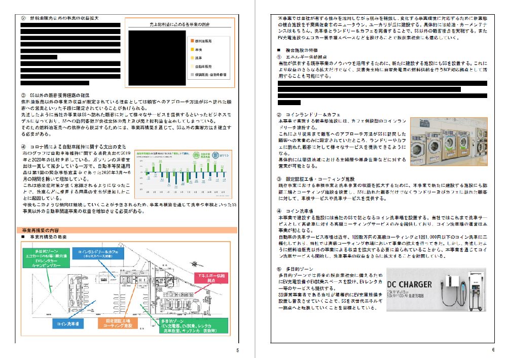 武衣:ありがとうございます!地域密着で自動車に関する幅広い事業を展開しているという強みを持つ御社が、更に事業の幅を広げて顧客接点を拡大していくという御社の事業計画が審査員の方にも伝わるように事業計画書の構成やデザイン、記載方法をまとめさせていただきました。